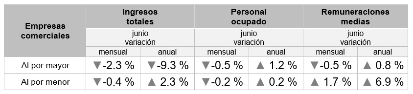 En línea con las bajas ventas que reportan los comercios, el personal ocupado tanto en las negocios mayoristas y minoristas reportan recortes: Mientras que en las empresas al por mayor la nómina disminuyó -0.5 por ciento de mayo a junio de este año, mientras que las minoristas bajaron -0.2 por ciento.